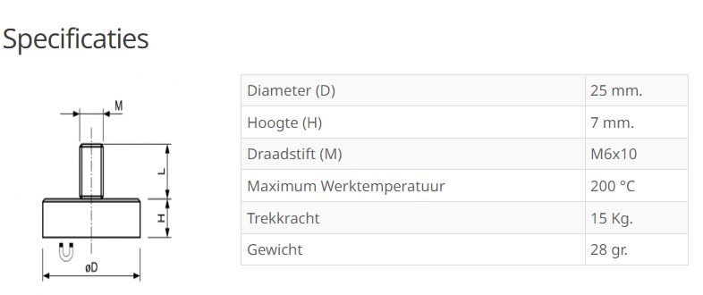 Afmetingen: 25 x 7 mm, draadstift M6 x 10 mm